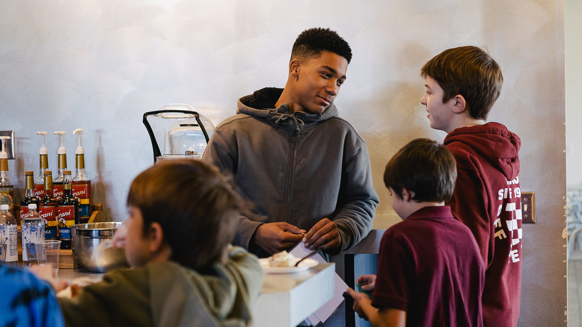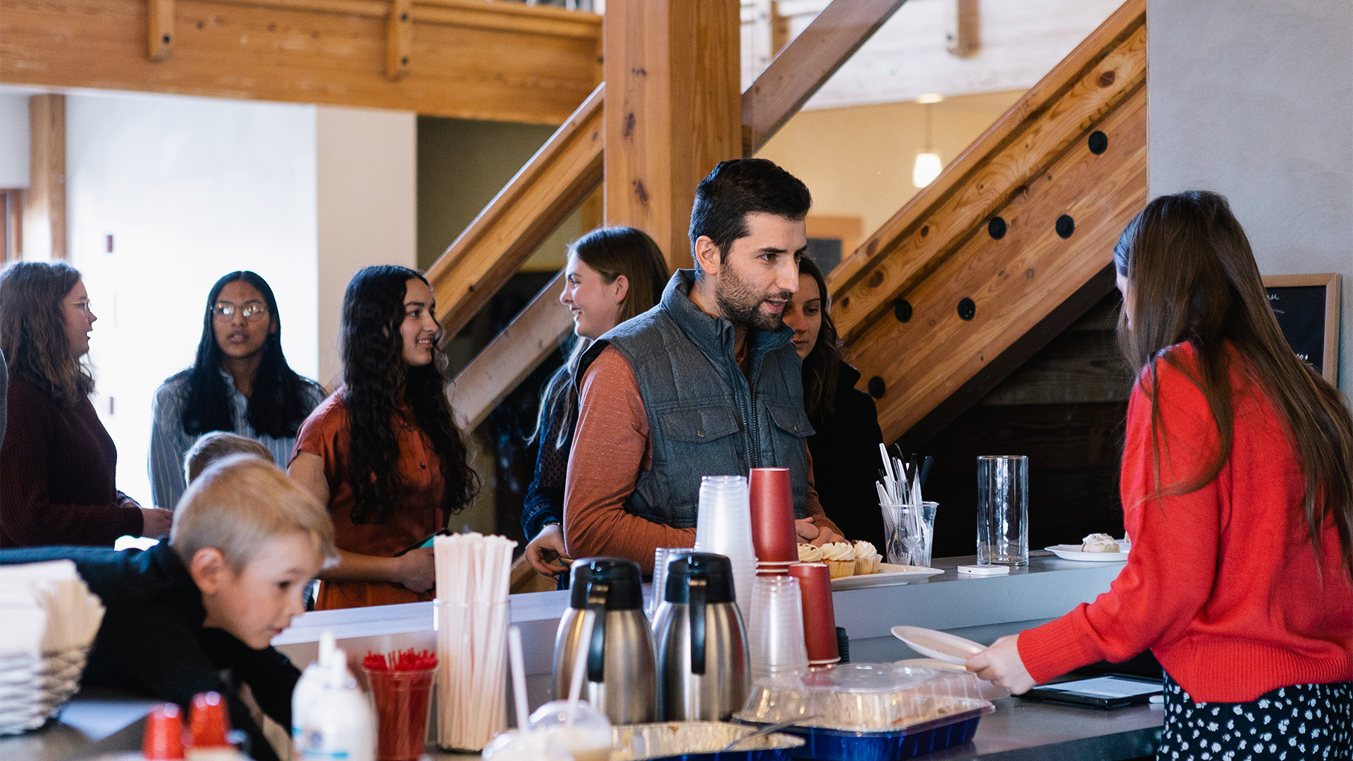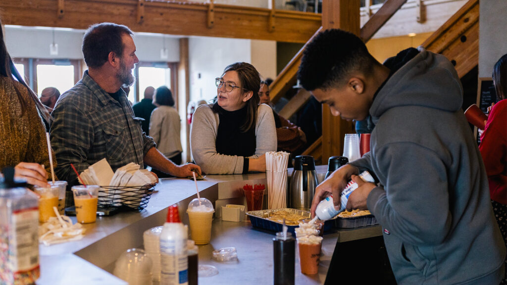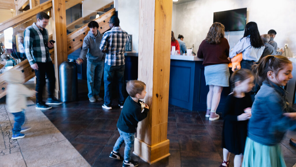 The meeting draws to a close. Everyone stands while several pray. The chorus of a song is sung to conclude the meeting. Children spill happily out of the Sunday school rooms, and the fragrant aroma of coffee drifts from the open coffee bar. The youth are raising money for their camps and other youth activities and today they are offering a delicious meal that families can purchase rather than leaving for lunch.