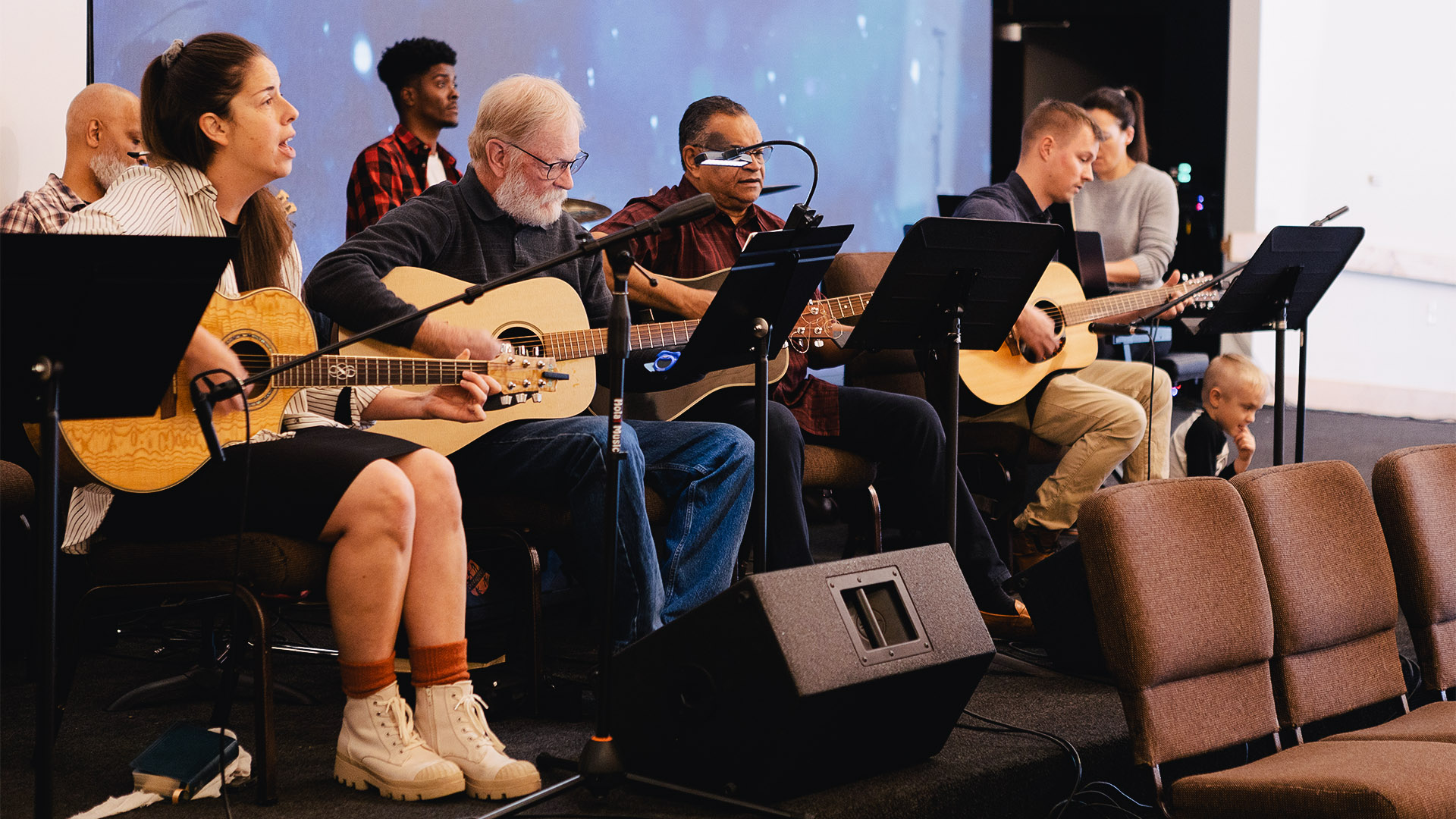 In the music section at the front of the sanctuary, some committed musicians provide uplifting accompaniment for the congregational singing. Today the various instruments include a piano, guitars, a trumpet, and drums that add lively rhythm.