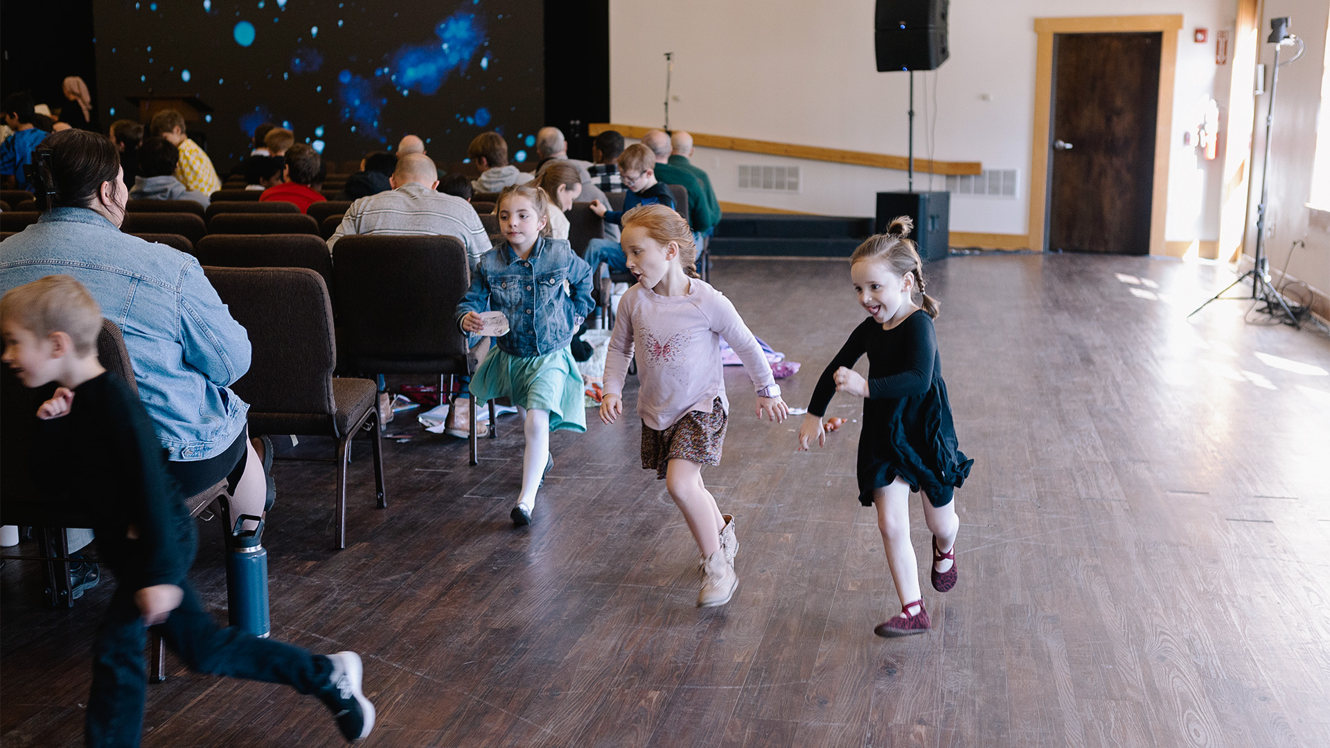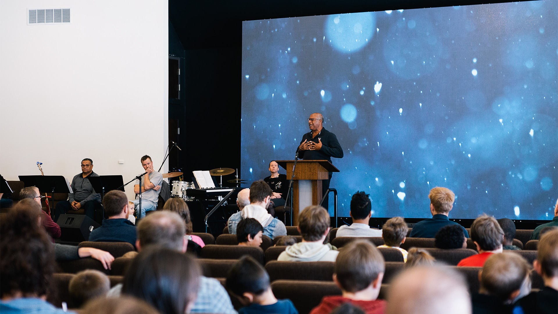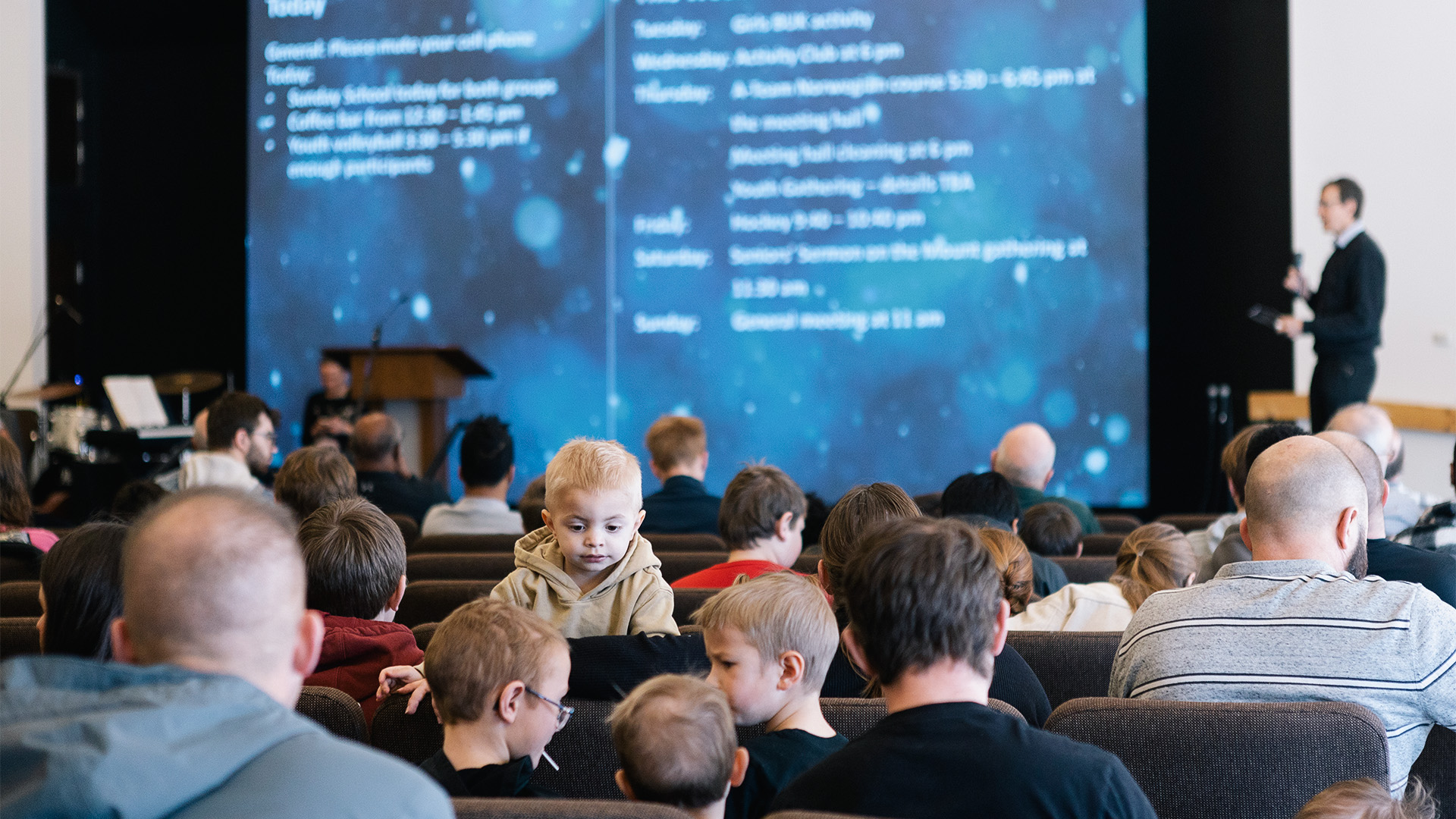 After a couple of songs have been sung, Nick reads the announcements which are projected onto the LED screen. On the agenda are special events for different age groups. The children look forward to a chaperoned trip to the zoo in a nearby city. The youth anticipate a sports evening, with pizza and treats to follow. A ripple of interest goes through the audience when a board game evening with refreshments is announced for the seniors.